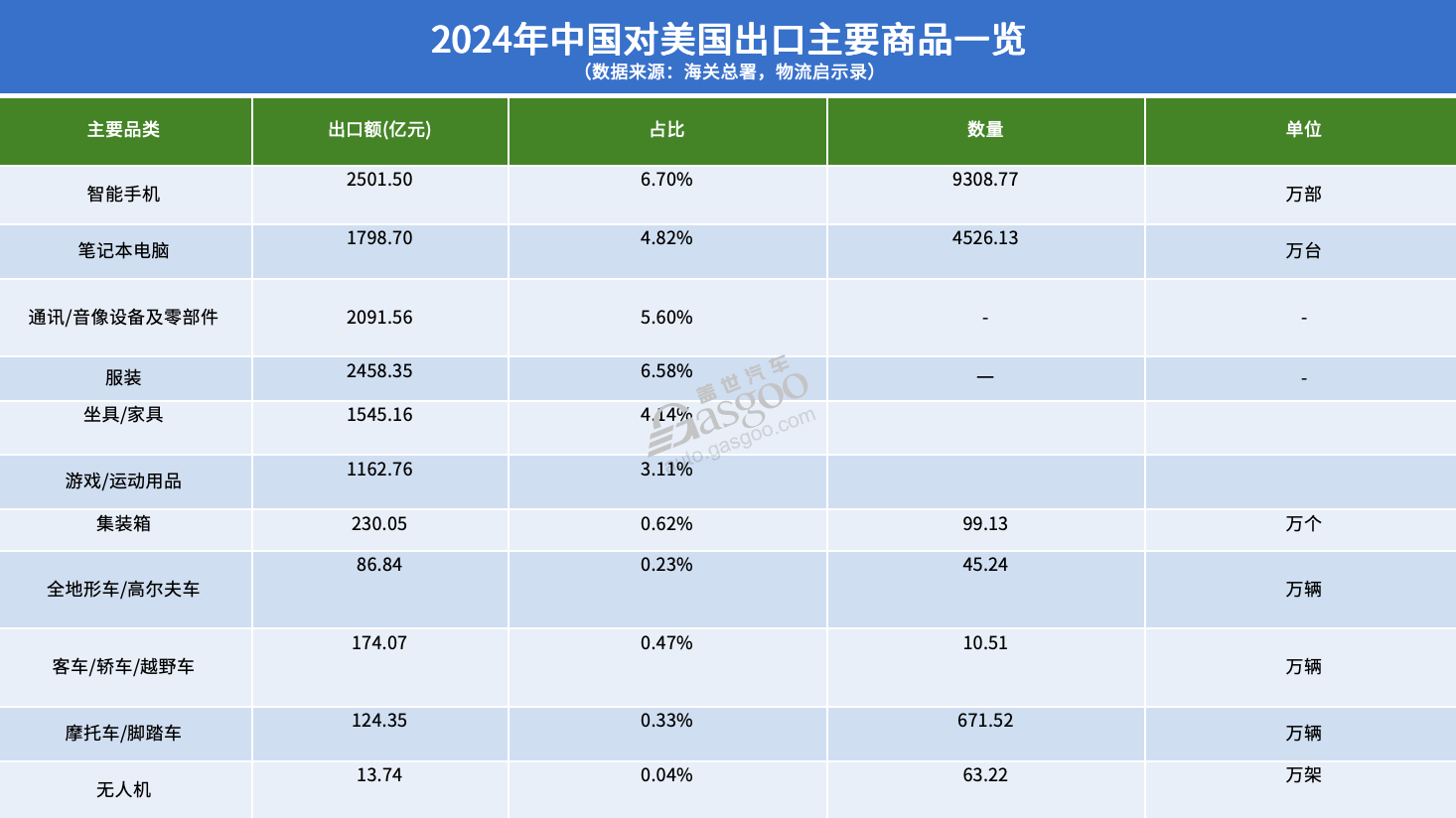 中国对美国出口的次要产物集中正在机械电子类,占出口总额的41。45%,达15475。84亿元。此中,智妙手机(2501。50亿元)、笔记本电脑(1798。70亿元)和通信及音像设备及零部件(2091。56亿元)是次要的出口商品。