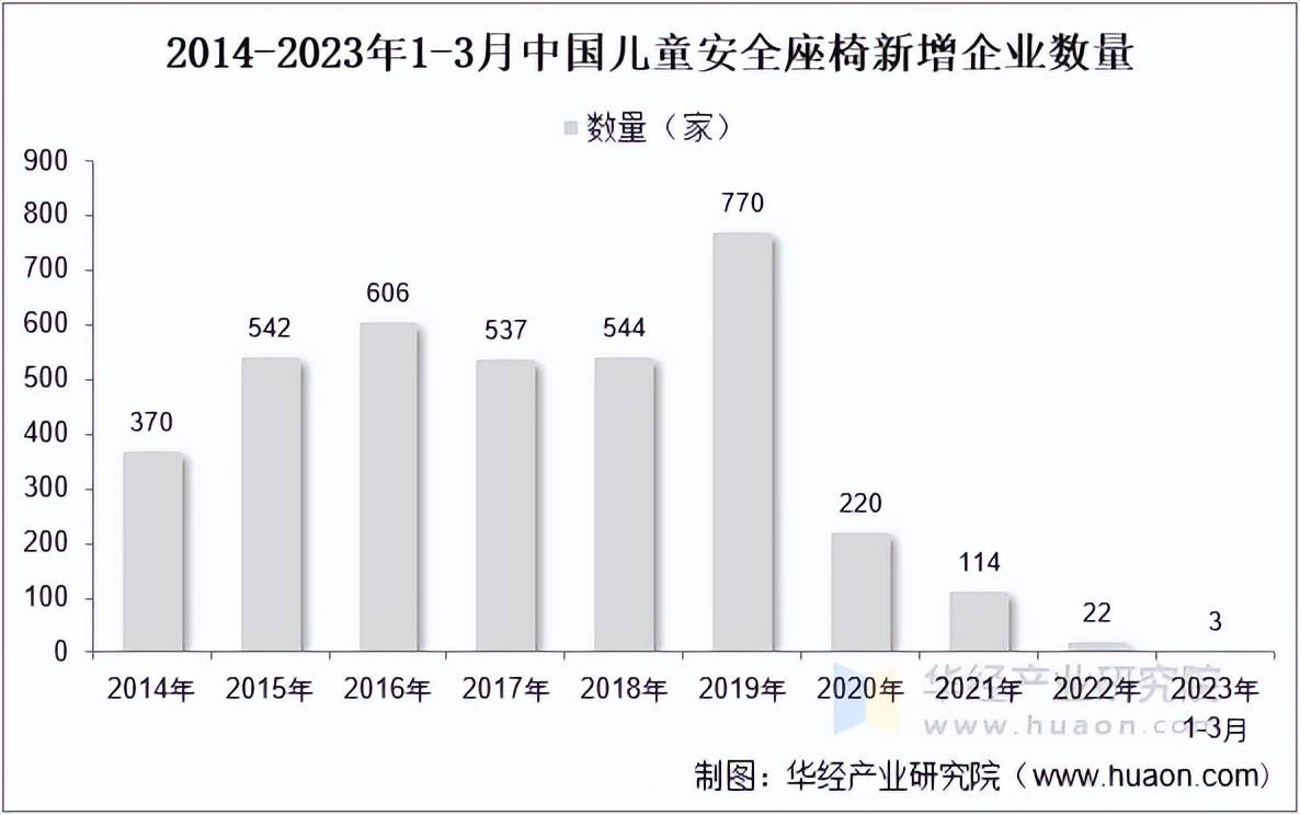 按照数据显示,中国儿童平安座椅新增企业数量正在2019年达到峰值,新增企业数量为770家,2020年中国儿童平安座椅行业遭到疫情冲击较为严沉,数量急剧下降,2023年1-3月中国儿童平安座椅行业新增企业数量仅为3家。