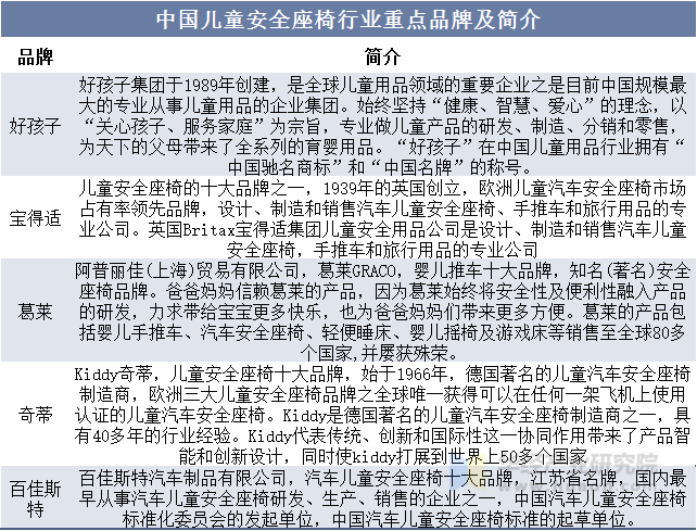 正在国外儿童平安座椅的普及率很高,国内虽然于2012年提出了儿童平安座椅的相关律例,此中好孩子、宝得适、葛莱、奇蒂、百佳斯特为儿童平安座椅行业品牌前五名。