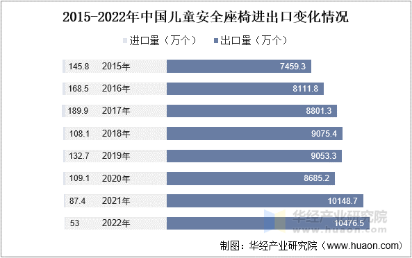 按照数据显示,中国儿童平安座椅进出口款式中,出口量远弘远于出口量,申明中国儿童平安座椅行业不依赖于进口产物,其进口量呈现逐年削减的态势,出口量呈现逐年添加的态势,2022年中国儿童平安座椅进口量为53万个,出口量为10476。5万个。